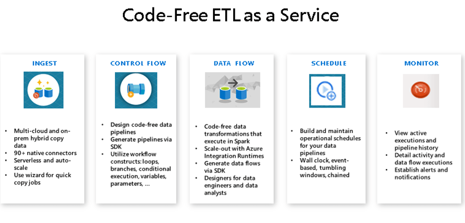 Azure Data Factory is a code-free ETL and data integration service that enables users to create data pipelines and workflows to ingest, transform and transport data at scale. Azure Data Factory can also be used to automate various maintenance tasks such as partitioning. Azure Data Factory is based on the on-prem ETL tool that comes bundled with SQL Server Enterprise Edition, SQL Server Integration Services (SSIS).