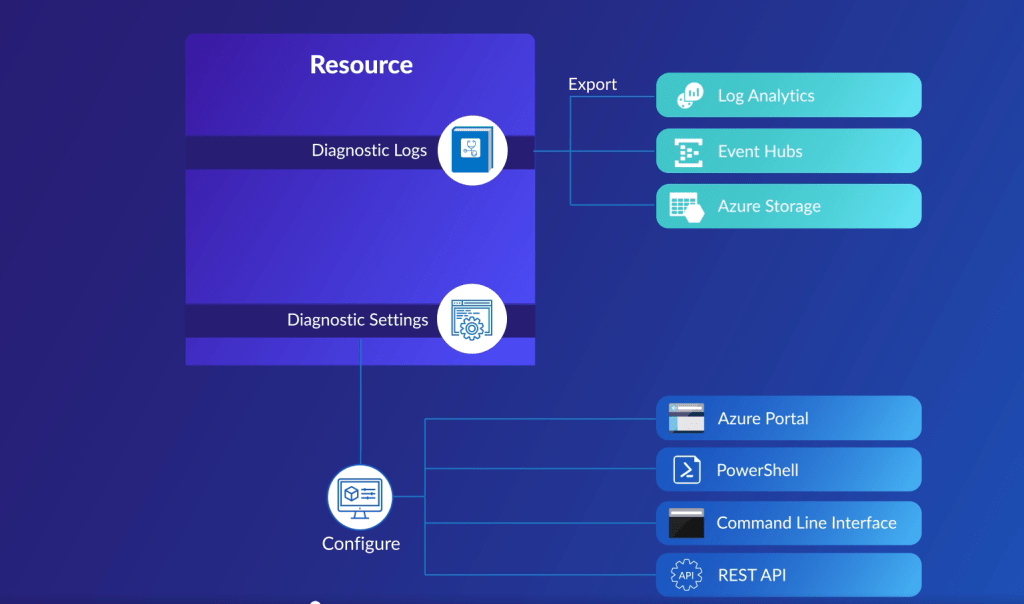 There are various ways to set up diagnostic logging in Azure: Azure Portal, PowerShell, Azure CLI or the Azure Resource Manager.