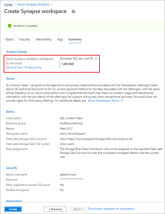 Also, the Azure Portal shows a summary tab with the estimated costs on the create workspace page for Azure Synapse Analytics.