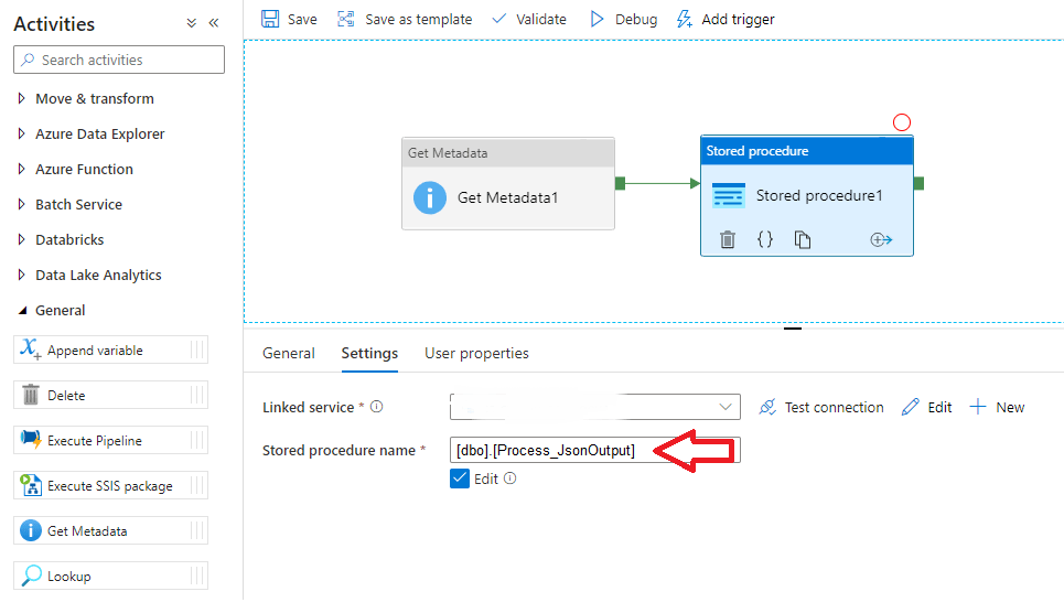 Step 3: Link the output of the Get Metadata Activity to the stored Procedure activity. Configure the settings for the Linked Service and select the stored proc that we created in Step 2.