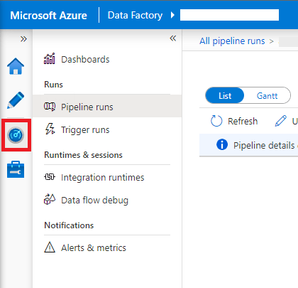 The easiest way to monitor Pipelines visually, is to go the Azure Monitor UI within the Data Factory Studio. To be able to do this, click on the Azure Monitor icon as shown in the screenshot below: