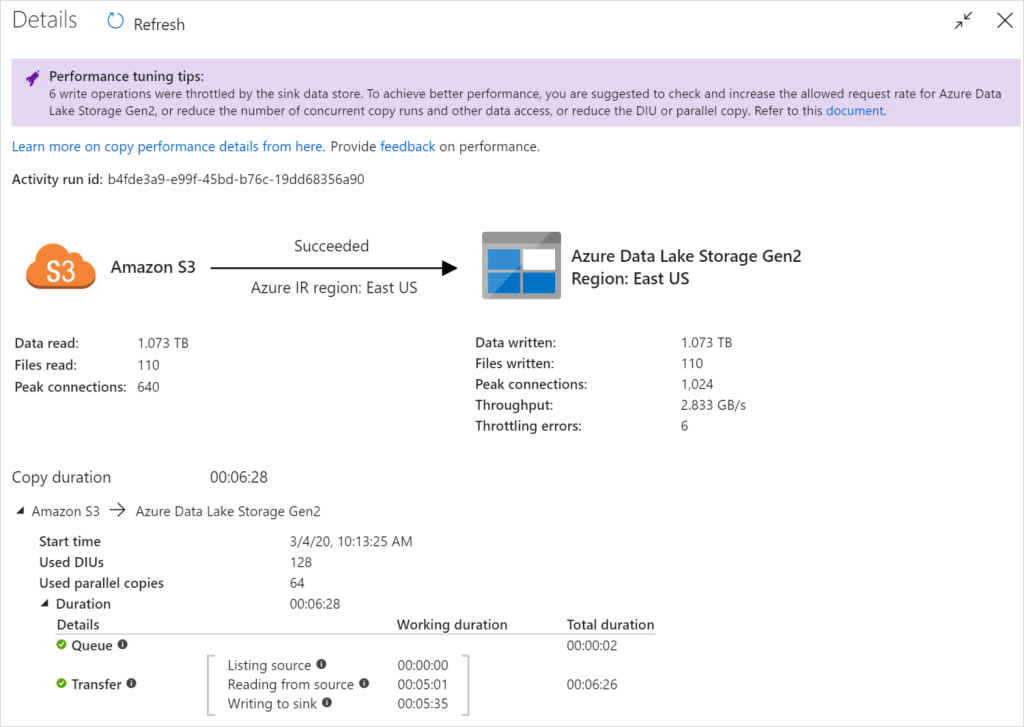 There are other details related to the steps during the data transfer, as well as performance counters such as DIUs and no. of parallel copies. These metrics will be discussed in a future post.