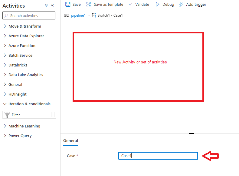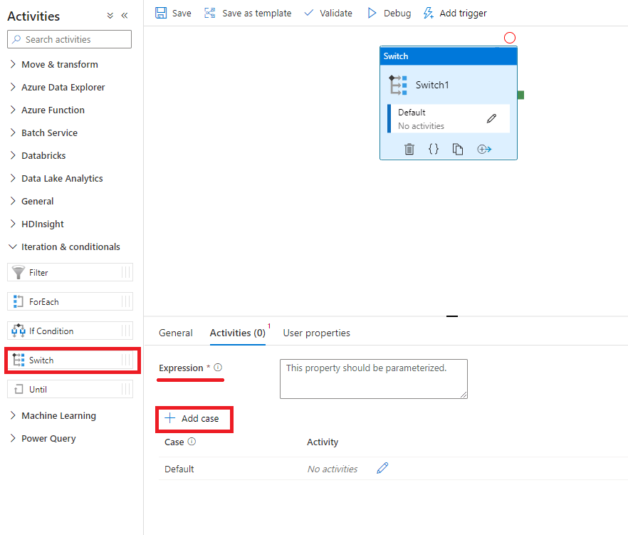 When we create a new Switch activity, it already has one case- the default case. This is the equivalent of the ELSE clause of the SQL Case statement.