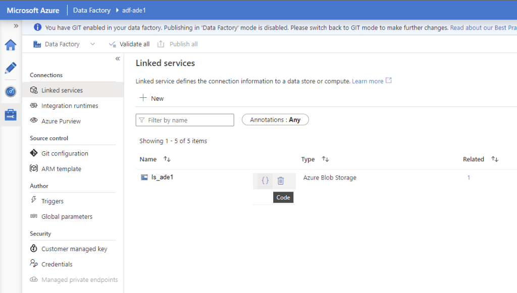 If you are familiar with Azure Services, you might know that the Linked Services or any other Azure artefact has corresponding underlying JSON code. We can modify this code to make changes to the Linked Services (such as, adding parameters.)