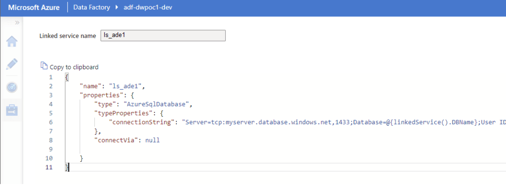 - This will bring up the JSON view of the Linked Service, which looks something like this: