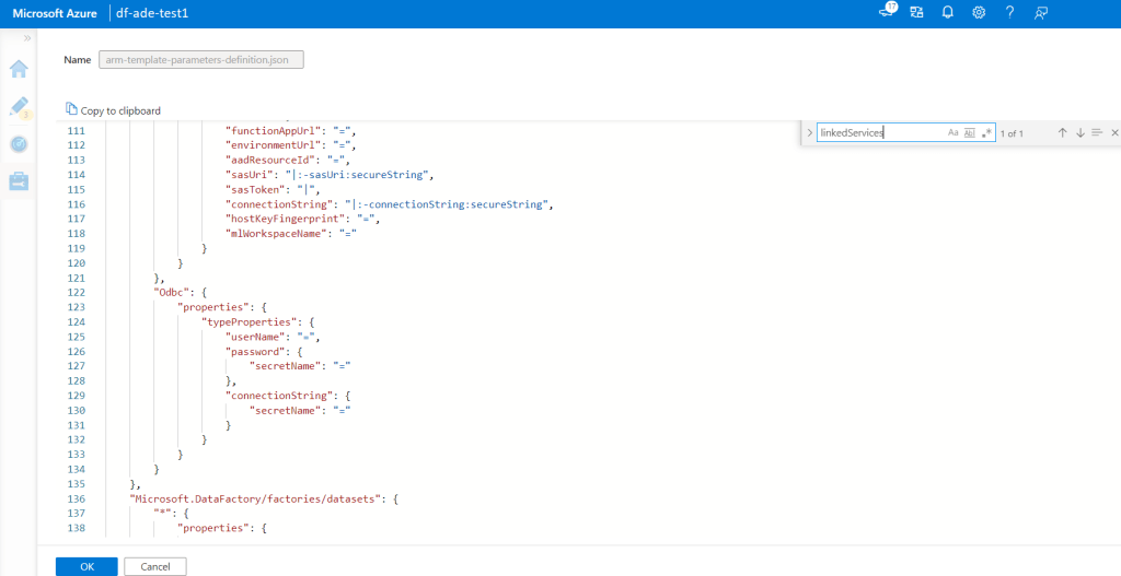 Now let’s consider a scenario, suppose we have updated a linked service and added a reference to a secret stored in the Azure Key Vault for the password property. Now we would this to appear as a parameter in the ARM template. We start by searching for “linkedServices” in the code and locate the linked service that has been updated.